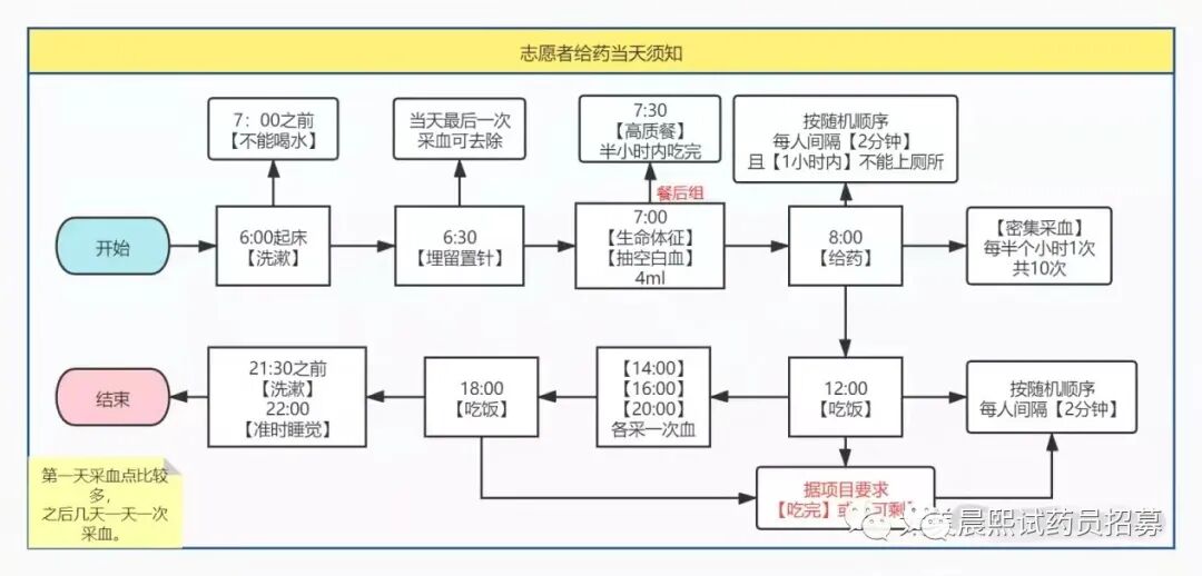 确认参加试验到体检前的这段时间务必不要熬夜、饮酒、注意个人卫生、避免剧烈运动;体检前两天尽量不要吃牛、羊、鹅肉粉(可能里面有罂粟果);清淡饮食,不要喝咖啡、茶、碳酸饮料、火锅、烧烤等。